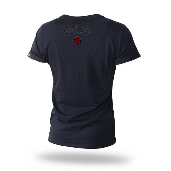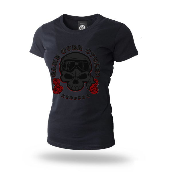 Koszulka damska z dużym nadrukiem na piersi w kolorze szarym prezentującym logo Game Over Cycles z różami. Na karku wzór GOC w mniejszym rozmiarze. Wykonana z wysokiej jakości bawełny. Klasyczny fason i subtelny, okrągły dekolt. Na lewym rękawku metka z logo Game Over Cycles.